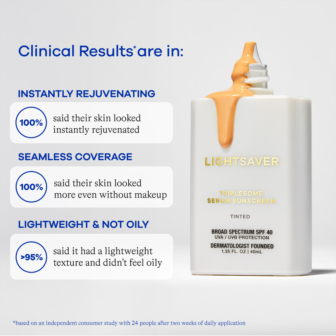 Dermatologist-formulated clinical tinted mineral facial sunscreen with SPF 40 with light silky velvety texture for glowy finish. Formulated with our proprietary Triplesome Repair Complex-3 to help protect, restore, and calm the skin. SPF Party Never Stops™ with LIGHTSAVER!
